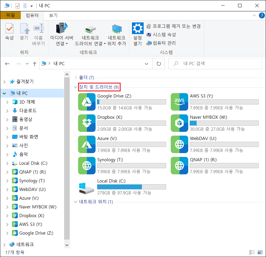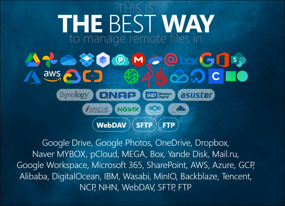 클라우드 스토리지, 표준 프로토콜(WebDav,FTP/FTPS,SFTP)을 지원하는 장비(NAS, 공유기, 서버)등과 연결하여, 파일 탐색기에 드라이브를 생성시켜, 언제 어디에서나 쉽고 빠르게 드라이브에 접속할 수 있습니다.