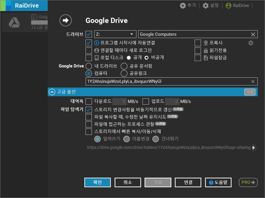 3. 컴퓨터 옵션을 선택하고, 폴더 URL 또는 ID를 입력합니다.