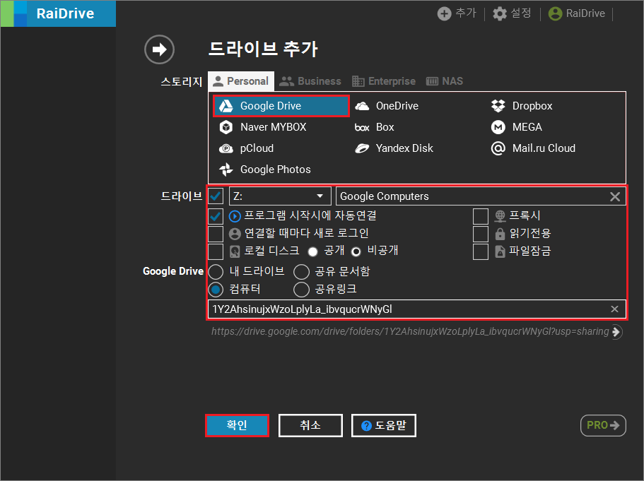 1. 스토리지에서 Personal 탭에 있는 Google Drive를 선택합니다.