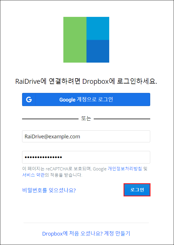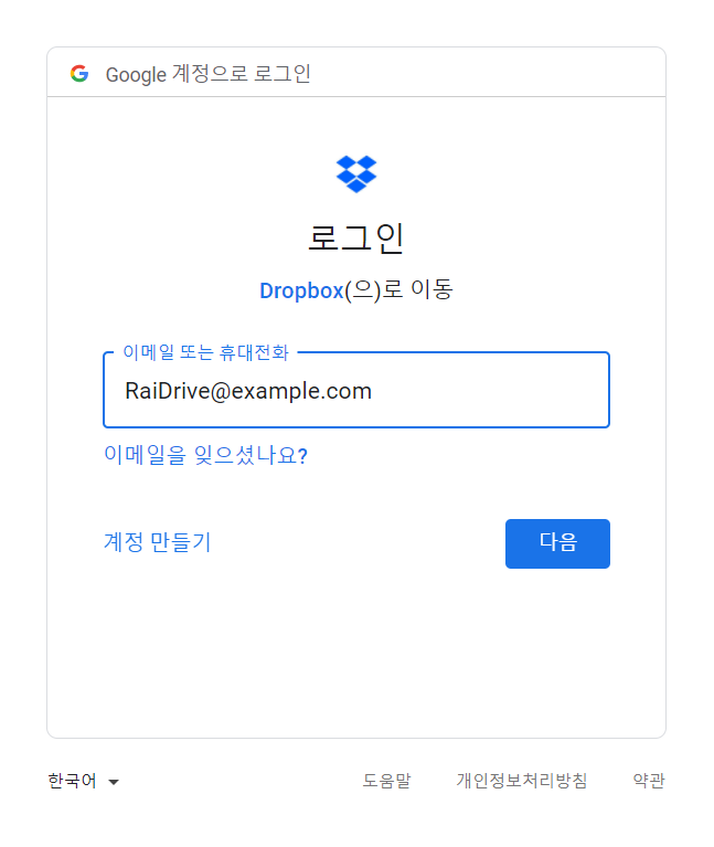 3. 확인 버튼을 클릭하면 다음과 같이 Dropbox 계정으로 로그인 할 수 있는 화면이 출력됩니다.