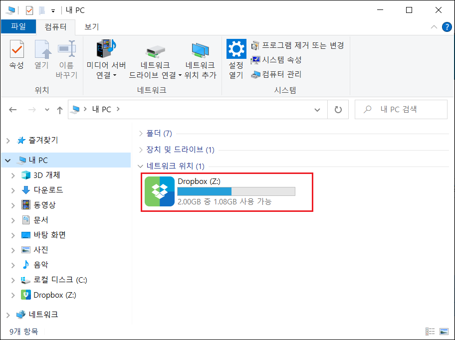 1. 끊기 버튼을 클릭하면 연결되어 있던 Dropbox가 파일 탐색기에서 제거됩니다.
