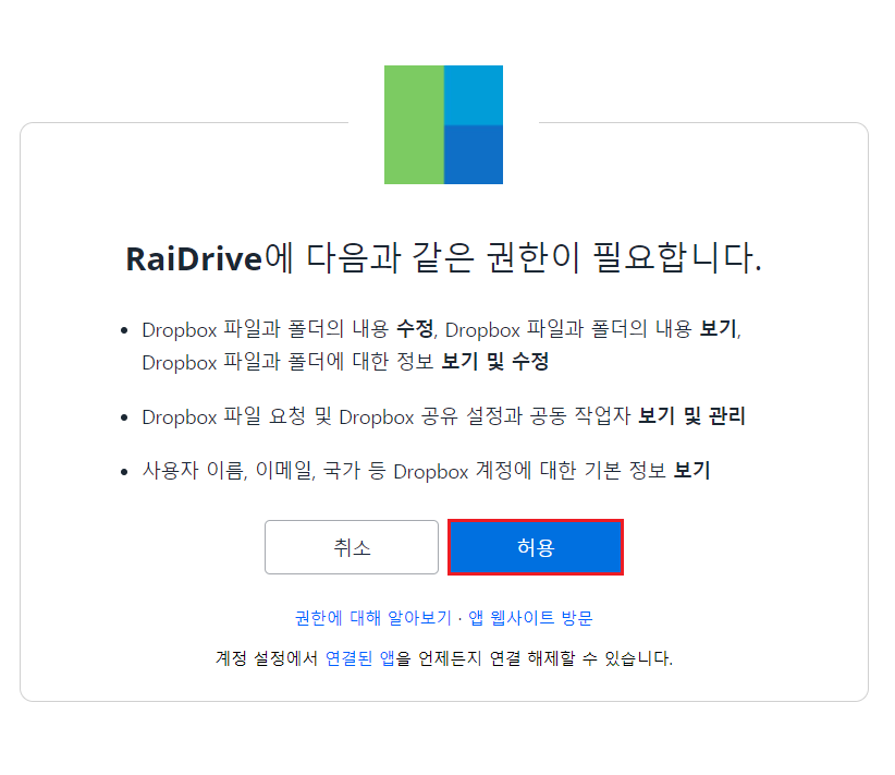 5. RaiDrive가 Dropbox 계정에 액세스 할 수 있게 하려면 허용 버튼을 클릭합니다.