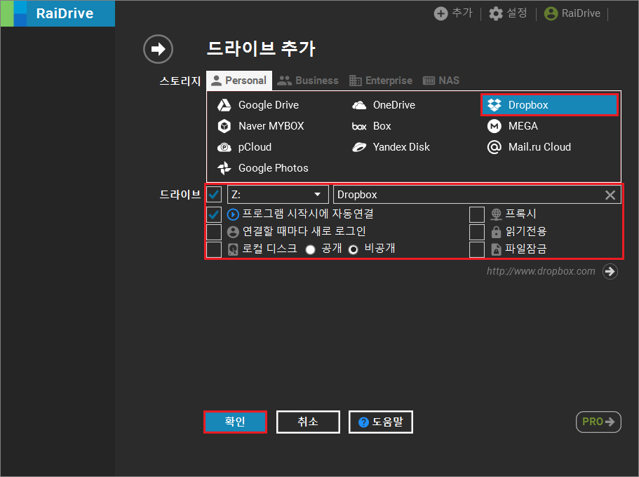 1. 스토리지에서 Personal 탭에 있는 Dropbox를 선택합니다.