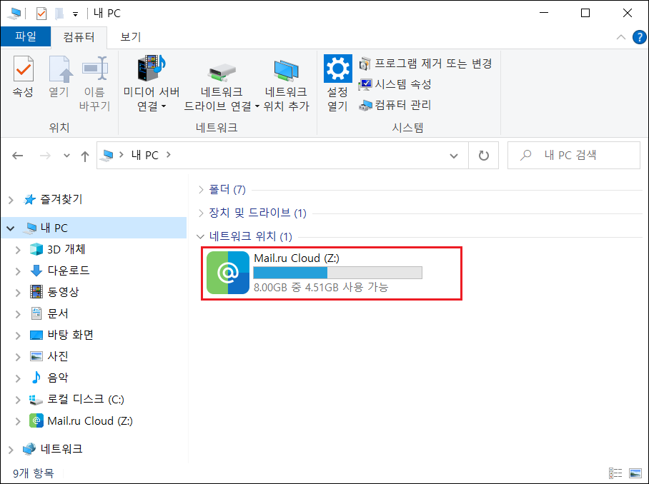 1. 끊기 버튼을 클릭하면 연결되어 있던 Mail.ru Cloud가 파일 탐색기에서 제거됩니다.