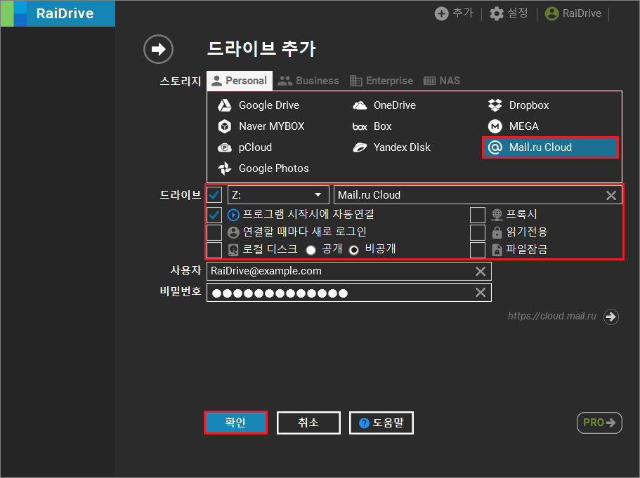 1. 스토리지에서 Personal 탭에 있는 Mail.ru Cloud를 선택합니다.