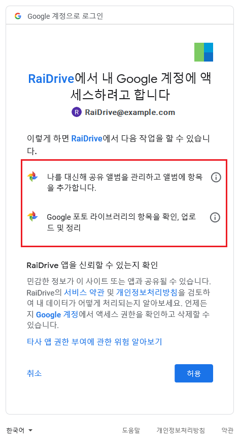 5. RaiDrive가 Google 계정에 액세스 할 수 있게 하려면 허용 버튼을 클릭합니다.