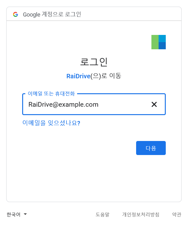 3. "Google 계정으로 로그인"이 나타나면, 이메일 또는 휴대전화를 입력한 후, 다음 버튼을 클릭합니다.