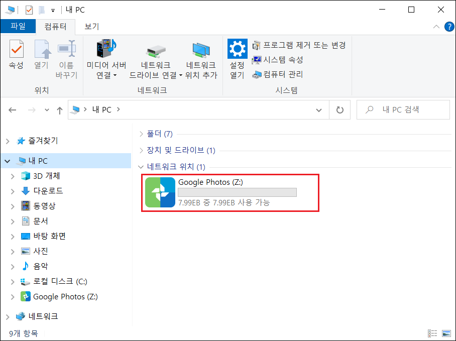 2. 연결 버튼을 클릭하면 Google Photos가 파일 탐색기의 네트워크 위치에 생성됩니다.